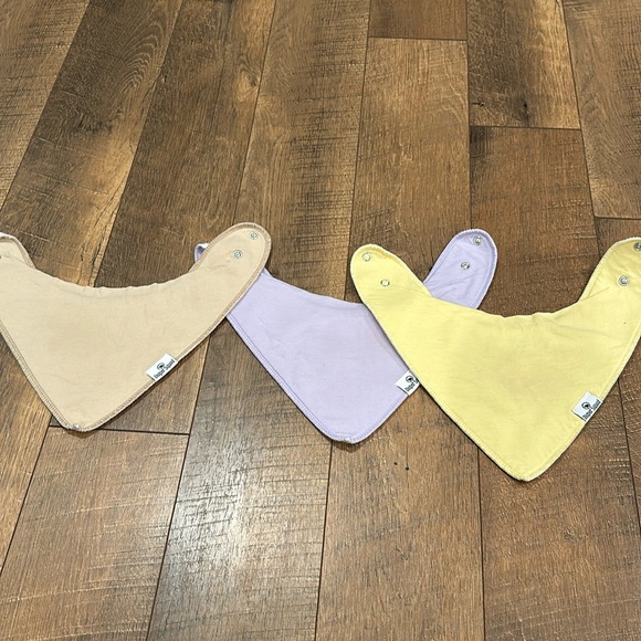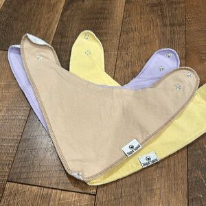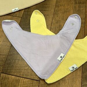 3 drool bibs. Yellow, Purple, and Tan.