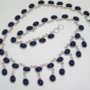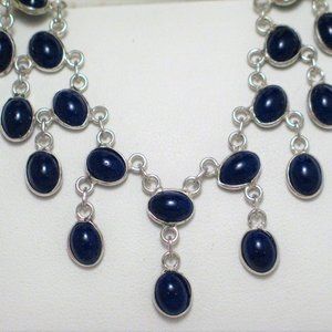 sterling silver w/ dark blue stone/glass cut cabs, bezel settings, bib focal point 2 tier dangles & secured by easy to use hook closure. Length 17" width at bib is 24.4mm, rest of chain 8.7mm, circa. Great necklace for suit outfits, casual, or night out on town, fun feminine, bold, Beautiful, & a pair of earrings to match unless someone grabbed them (I had to add % here on Pm. due to Fees) This item can also be found on my website online at Blingschlingers Jewelry in the Necklace Section