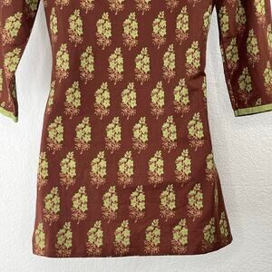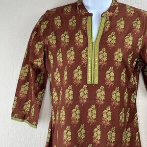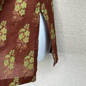 Biba Brown Floral Indian Tunic Top 100% Cotton Split V-Neck 32/US 0-2 NWT