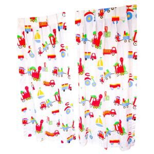 From the Bibb Company of Macon, Georgia is this pair of white panel curtains. The curtains are accented with ABC’s blocks, trains, sailboats, fire trucks, wagons, and more toys of childhood. The curtains are pleated at the top border.