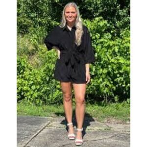 Pull on, elastic waist with sash tie belt, and button up bodice. French textured terry with 3/4 sleeves.