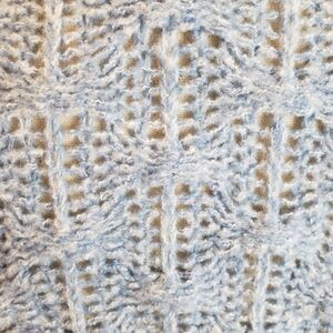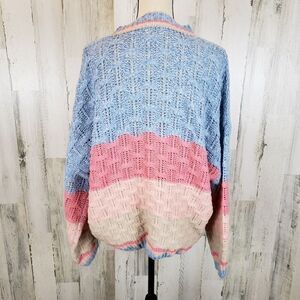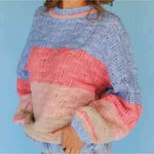 ~ Description: Blue, pink and tan striped sweater, chunky knit, open weave