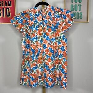 Vibrant floral dress with ruffle details. Features orange, blue, and green flowers.