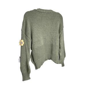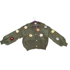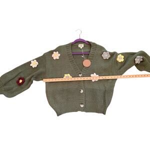 Bibi Flower Crochet Patches Knit Sweater Cardigan Olive Green Womens Size L NWT