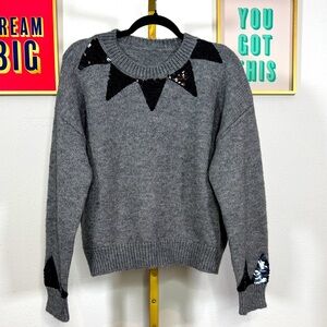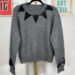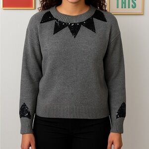 Cozy gray sweater featuring stylish black accents. Perfect for a chic and comfortable look.