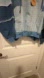 Stylish patchwork denim hoodie with a zip-up front. Features a mix of dark and light blue shades. Oversized dolman sleeves. Light to mid weight.