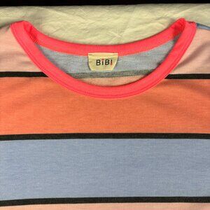 This vibrant and fun striped tee from Bibi features a striking color block pattern with shades of blue, pink, and orange. The neon pink trim around the neckline and sleeves adds a playful touch, making it perfect for a casual, yet stylish look. The soft and stretchy fabric ensures a comfortable fit for all-day wear.