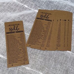 Bible Emergency Numbers Bookmark Bible Page Marker Qty 25 Brown Card Stock NWOT Set of 25 Bookmarks with Bible Emergency Numbers for time of need in brown with blank backs for notes 6" tall x 2.5" wide approximate measurements Bible Emergency Numbers Bookmark Bible Page Marker Qty 25 Brown Card Stock NWOT