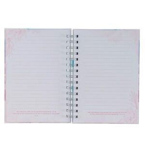 Beautiful spiral notebook with a blue and pink watercolor design on the cover and back. The interior pages include scripture ms at the bottom. The exterior features Psalm 46:10 - Be still and know that I am God