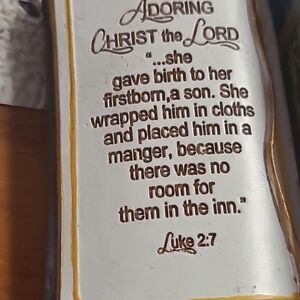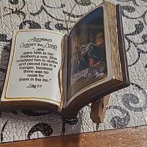 Beautiful decorative book ornament featuring a mativity scene. Perfect for holiday decor.The Bible is open to Luke 2:7. I have two of these.