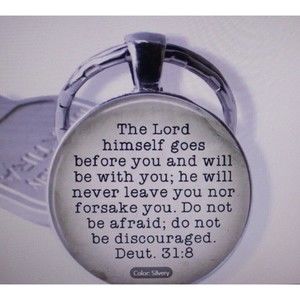 Round bubble bible verse keychain with the verse: The Lord himself goes before you and will be with you; he will never leave you nor forsake you. Do not be afraid; do not be discouraged. Deut. 31:8. Silvertone ring with tan bubble.New in package.