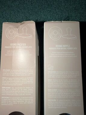 BNIB lot of 2 boxes of Bibs brand pacifiers. Size 2, for ages 6 months and up. Made with natural rubber. One box is nude colors and the other is blue colors. From a smoke free, pet friendly home.