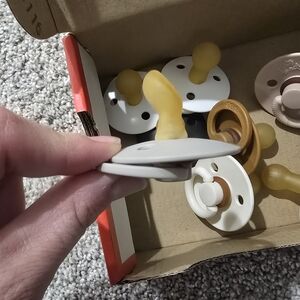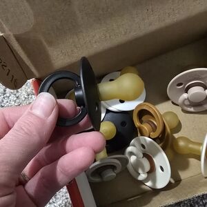 These baby pacifiers come in a variety of colors including white, black, and cream, sand, and sage. Perfect for soothing your little one. Round and Anatomical.