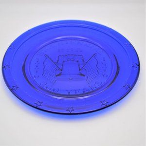 Bicentennial Cobalt Blue Small Glass Saucer Plate Decor w/ Liberty Bell & Flags