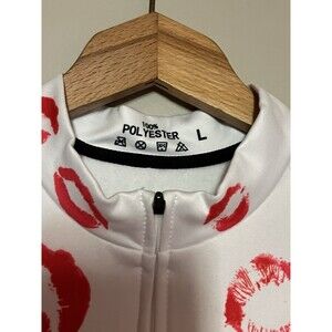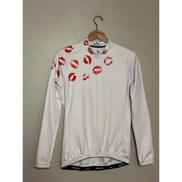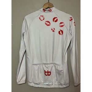 This pre-owned women's cycling jersey by Bicycle Booth features a solid white color with a hot lips kiss design, perfect for cycling in winter, fall, or spring. Made of polyester fleece, the long-sleeve jersey is lined for added warmth and comfort. It has a zip closure, making it easy to put on and take off, and is machine washable for convenience. The size is Women's Large and the fit is regular, suitable for various cycling activities such as gravel, mountain, and road biking. Ideal for the Strava Queen looking for stylish and functional activewear.