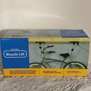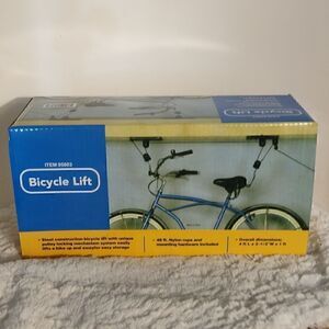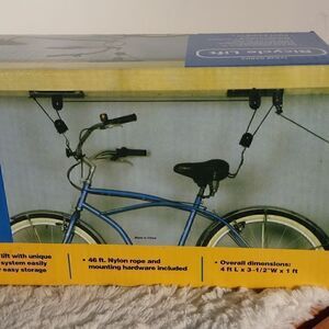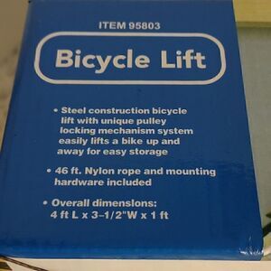 This New in box steel construction bicycle lift with pulley locking mechanism system easily lifts a bike up and away for easy storage. 46' nylon rope and mounting hardware included. Overall dimensions: 4' long x 3-1/2" wide x 1'. All offers are welcome. Cannot be bundled with other items due to weight.