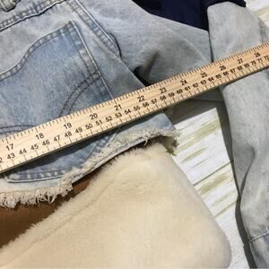 This jacket is in excellent like new condition! Up cycled redone deconstructed style patchwork multi layer denim jean jacket. Cozy warm faux Sherpa lining. Faux suede leather accents. Women’s size large. 4.28.23