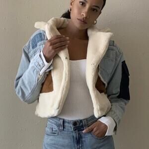 Bida EUC Faux Sherpa Faux Suede Patchwork Denim Jean Jacket Coat Size Large