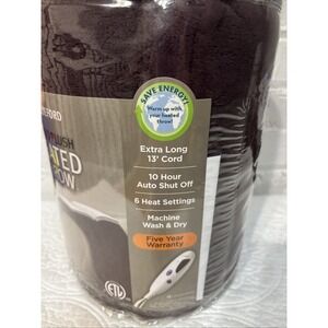 Brand new unopened, brown Biddeford micro plush heated throw blanket standard throw size with an extra long 13 inch cord 10 hour auto shut off and six heat settings. It is machine washable.