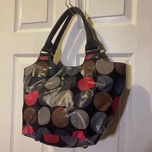 Biden coated canvas multi color Polka Dot medium Tote Bag Brass hardwares Top magnetic snap closure the inside lining has a side zipper two side pockets. Pre owned in good used condition signs.signs of wear on the bottom four corners.have small wears see all pictures any questions please message. Z3