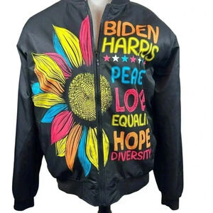 2020 Biden Harris colorful jacket. Has flower and wording/ Peace, Love, Equality, Hope and Diversity. Black quilted. Zip front. Made my GarmentOne. Excellent condition. Size small.