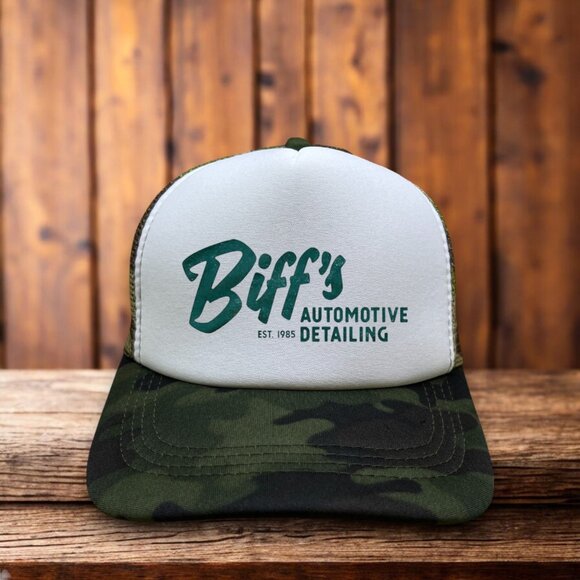 Biff's Automotive Detailing Mens Trucker Hat Camo Back To The Future Marty McFly