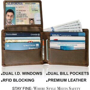 🧿✅ LARGE CAPACITY YET SLIM - Measuring only 4.3" x 3.5" when closed, our slim mens wallets have a large capacity of 8 card slots & 2 Flip up ID Windows. Plus a split billfold to keep you organized.