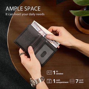 * SLIM YET SPACIOUS: Unlike most bulky and oversized wallets, this wallet is slim and compact, measuring only 3.93'' x 3.54'' x 0.4''. Despite its slim profile, it has a large capacity with 7 card slots, 1 ID window, and 1 cash compartment, providing ample storage for your daily essentials.