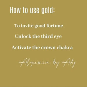 Gold brings connection to the universe and its knowledge, natural energies, and wisdom. It symbolizes purity in a spiritual sense and the development of total understanding. It unlocks and activates the third eye and crown chakras.