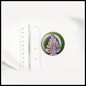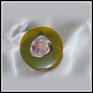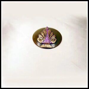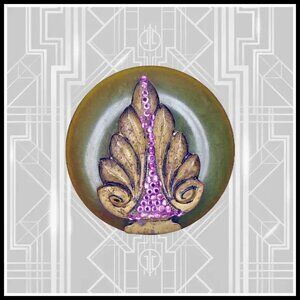 Rock this one of a kind large Deco style Bakelite pin (made with real tested vintage Bakelite) with a retro outfit or a modern one. Every tiny pink rhinestone set by hand and I've been cross-eyed ever since. Guaranteed to be genuine Bakelite. Base is a big ''spinach'' or ''pea soup'' Bakelite button. Art Deco tarnished brass stamping treated to antique finish to bring out details. Tiny flat back rhinestones are Swarovski crystals. It's a relatively big one (see ruler shot). Special finish in the back. Comes in a gift box. QUICKLY: I started recycling vintage jewelry in 1991 and stopped years ago. In 2002, I was ''Bakelite-Crazy''. This is leftover stock and the last of 3 in the line. ! other is listed, the other coming soon