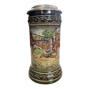 Gorgeous vintage West German beer stein by Staffel Stoneware. Heavy and sturdy, high quality ceramics. It features colorful English jousters and their horses. This beer stein has a pewter lid with engraved letters HS.