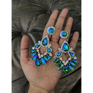 Big Blue green earrings large crystal chandelier rhinestone crystal 3.6” long