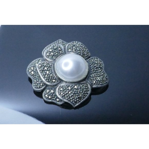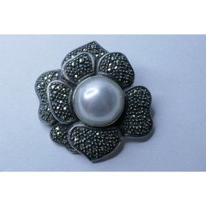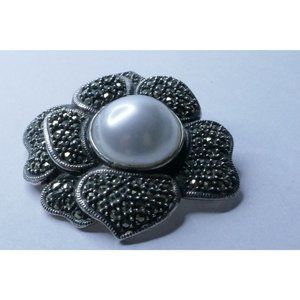 Big Bold Signed Judith Jack Sterling Silver Marcasite Faux Pearl Flower Brooch