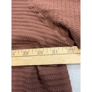 Soft, Stretchy material. V Neck, Collared. Id say its a rusty brown. Is that a color on the color wheel?