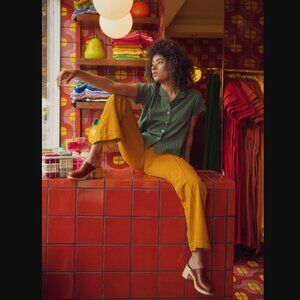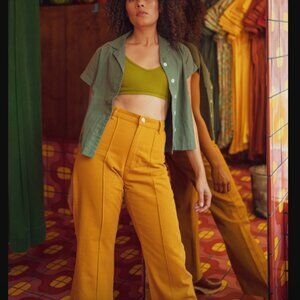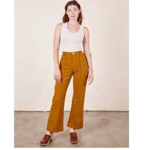 Big Bud Press Western Pants - Spicy Mustard Unisex S. 70's styling and silhouette with a flared leg. These pants have a beautiful pin-tuck that runs the length of each leg. Elastic has been added at the back to ensure a better, more generous fit! Wider in the hips for our friends who need that. No front pockets to maintain its gorgeous silhouette but two big back pockets for anything you need. Made from our signature durable 9oz 100% cotton twill. Our twill does not have stretch built into the fabric but all of our pieces break in beautifully with wear and conform to your body with time! waist is 14" across, rise 12", inseam 29"