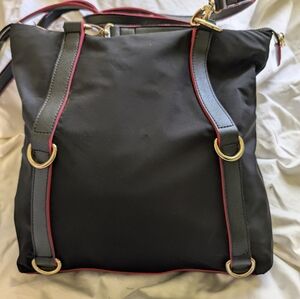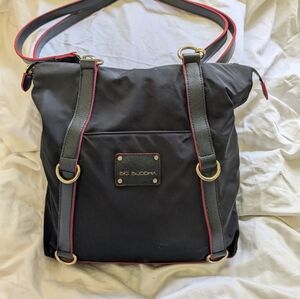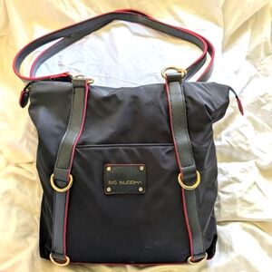 Chic Big Buddha tote in black with striking red trim. Gold rings and adjustable straps enhance style.
