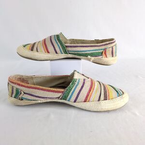 Features: Lightly padded footbed, stretch panel, fabric, colorful striped canvas upper, flats