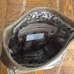 This is a beautiful faux leather tote with great pocket storage! The bag is lined with animal print fabric, while the handles are gold finished.