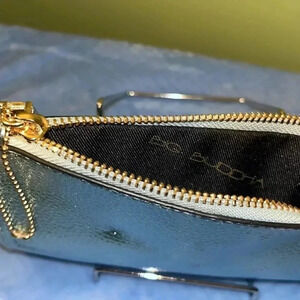 In excellent preloved shape blue metallic bag with a keychain. Can be used for makeup, large wallet or wristlet. Measurements are