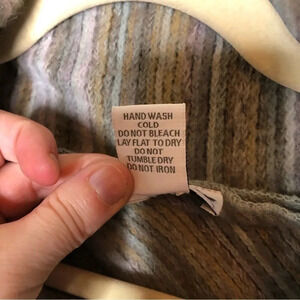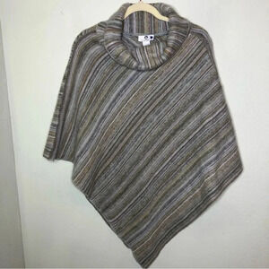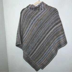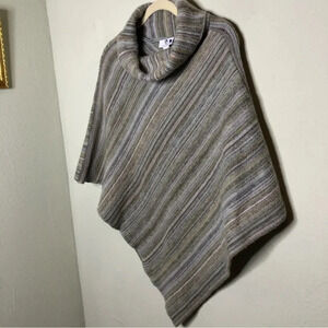 Beautiful poncho that I thought was alpaca when I first touched it. So soft! Colors are shades of gray, pink, light blue and tan.