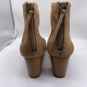 Taupe ankle boot from Big Buddha. Peep toe. Perforated upper. 3” block heel. Back zip. Size 9. Good preowned condition with minor wear. See photos for full condition.