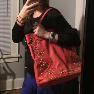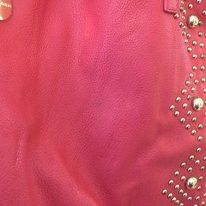 Pink/orange Big Buddha bag with gold metal detail. There is a small area of discoloration on the front- see 4th pic.