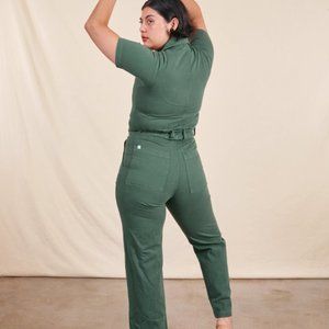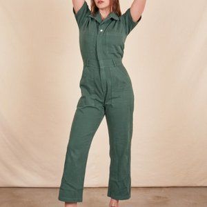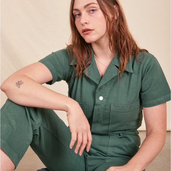 One jumpsuit to rule them all! The perfect statement piece. Vintage workwear inspired. Made with our signature durable 8.5oz 100% cotton twill. Our twill does not have stretch built into the fabric but all of our pieces break in beautifully with wear and conform to your body with time! Custom Sun Baby logo snap enclosure. Heavy duty stitching ensures this piece is workwear quality and made to last! Elastic in back of waist for an updated look on a timeless classic.