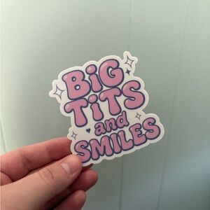 Add some bold energy to your water bottle, laptop, mirror, or wherever you need a little cheeky confidence! This “Big T-its and Smiles” sticker is all about unapologetic vibes and playful empowerment. With soft pink bubble letters and sparkly accents, it’s the perfect mix of sassy and sweet.