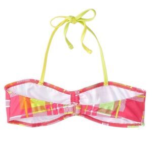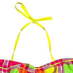Vibrant plaid bikini top with halter straps. Features a mix of pink, yellow, and green colors.