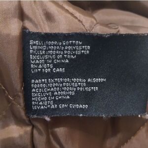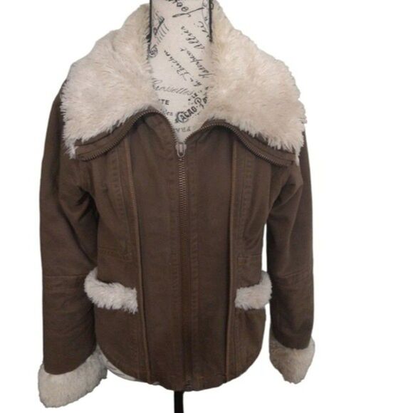 Cozy tan jacket with soft white trim. Features a front zipper and warm pockets. Ideal for cold weather.