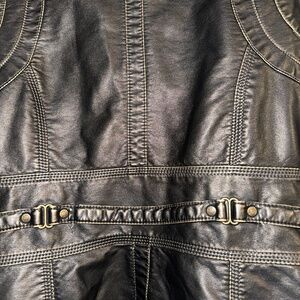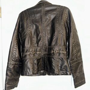 Edgy and vintage-inspired moto jacket by Big Chill. Features decorative buckles, stud accents, bronze undertones, and flattering structured seams. Soft faux leather that looks surprisingly real and has held up beautifully.