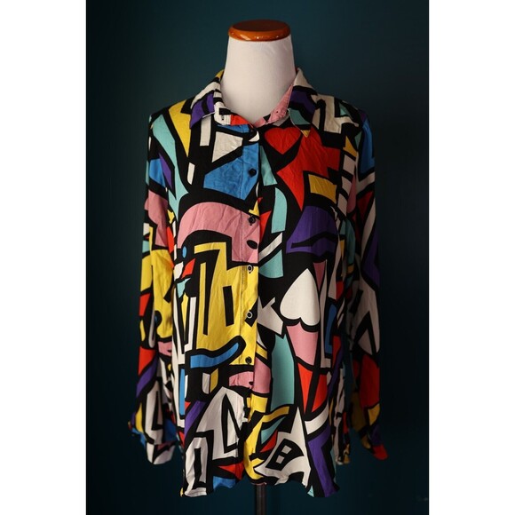 Big Dart 80s Style Colorful Geometric Pop Art Button Up Long Sleeve Color Block
