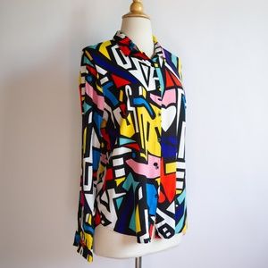 Big Dart abstract pop art colorful button down top. Long sleeves with button closures. Flowy material. In excellent condition. No flaws or pilling. Fabric and care tags are missing. I believe this is a synthetic blend like rayon and is machine washable.