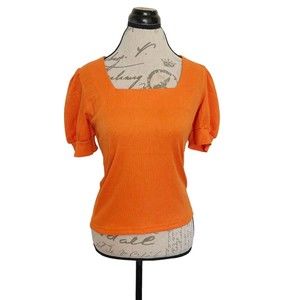 Big Dart Womens Blouse Orange Puff Sleeve Pleated Stretch Crinkle Size Medium